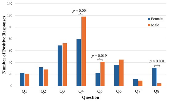 Descriptive statistics (means, standard deviations, and frequencies) were computed for each variable. Fisher’s exact tests were used to determine whether nonrandom associations existed between the binary variables collected. Comparisons included responses between SNAC questions and sex differences in response to the SNAC. For each comparative test between SNAC questions, odds ratios were also computed to quantify the strength of the association between positive responses for each question. Independent samples t-tests were performed to determine age-related differences across binary variables (sex, SNAC questions, response to a consultation). Significance level (α) was set to 0.05, and no data were missing from the standard eight nutrition questions. Statistical analysis was performed using SPSS (IBM Corp., Armonk, NY, USA, https://www.ibm.com/spss).