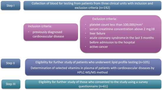 The study group included 192 patients treated in the Department of Cardiac Intensive Care and Internal Medicine, Heliodor Święcicki Clinical Hospital of Poznan University of Medical Sciences, and the 1st Department of Cardiology and Department of General and Vascular Surgery, both at the Transfiguration Clinical Hospital of Poznan University of Medical Sciences. The criterion for including a patient in the study was a previously diagnosed cardiovascular disease: atherosclerosis, arterial hypertension, ischemic heart disease, and infarcts of various organs. The exclusion criteria included a number of platelets below 100,000/mm3, a serum creatinine concentration above 2 mg/dL, liver impairment, acute coronary syndrome in the last three months before admission to the hospital, and active cancer. A group of 105 patients met the above criteria. In this group, in the first stage, the lipid profile, namely, low-density lipoprotein (LDL), high-density lipoprotein (HDL), total cholesterol (TC), and triglycerides (TG), were assessed, and plasma concentrations of retinol, α-tocopherol, β-carotene, 25-hydroxyvitamin D2 (25-OH-D2), and 25-hydroxyvitamin D3 (25-OH-D3) were determined. The biological material for the study consisted of venous blood (5 mL) collected from the patients using EDTA aspiration-vacuum sets.