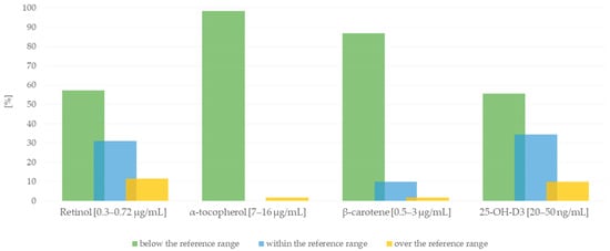 Percentage distribution of retinol, α-tocopherol, β-carotene, and 25-OH-D3 plasma concentrations in the study group of patients in relation to reference values.