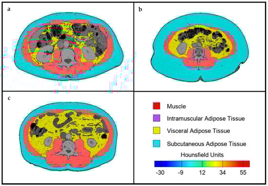 The following variables were recorded: skeletal muscle area or SMA (cm2 and %), skeletal muscle index or SMI (cm2/m2), intramuscular adipose tissue area or IMAT (cm2 and %), intramuscular adipose tissue index or IIMAT (cm2/m2), visceral fat area (VFA) (cm2 and %), subcutaneous fat area (SFA) (cm2 and %), visceral fat index (VFI) (cm2/m2), subcutaneous fat index (SFI) (cm2/m2), and mean Hounsfield units (HU) value for each segmented tissue.
