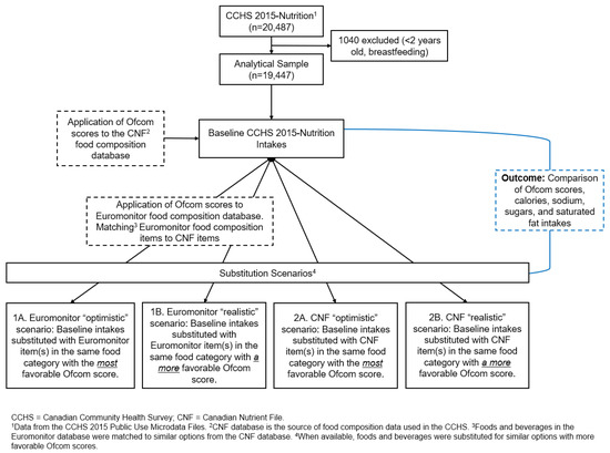 This study modelled four scenarios in which the dietary intakes of Canadians were altered by “replacing” foods and beverages (foods) in the diet with foods that have better NP scores when such foods were available. Briefly, using the Ofcom NP model and dietary data collected from the 2015 Canadian Community Health Survey (CCHS)–Nutrition, we modelled scenarios that substituted foods reported as consumed in the CCHS 2015 survey with similar foods from the same food category that had lower Ofcom scores. Substituted foods were obtained from two different food composition databases (Euromonitor and the Canadian Nutrient File (CNF)) and under the assumptions of both realistic and optimistic substitution scenarios (Figure 1).