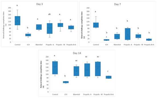 Completion time (in s) for the Rotarod challenge on days 3, 7, and 14. Different letters indicate a statistically significant difference (p < 0.05). For example, groups labeled with ‘a’ and ‘b’ are significantly different from each other, while groups labeled with ‘ab’ and ‘b’ are not significantly different from each other.