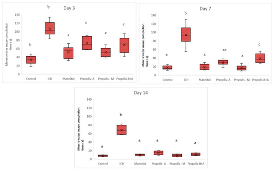 Morris water maze completion time (s) on days 3, 7, and 14. Different letters indicate a statistically significant difference (p < 0.05). For example, groups labeled with ‘a’ and ‘b’ are significantly different from each other, while groups labeled with ‘ab’ and ‘b’ are not significantly different from each other.