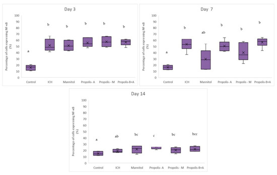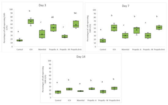 Figure 3 displays the percentages of cells expressing SUR-1. The control group had the lowest percentage of cells expressing SUR-1 (p < 0.05) compared to all other groups. The mannitol and propolis-M groups had lower percentages compared to the ICH, propolis-A, and propolis-B+A groups (p < 0.05). Additionally, there was no significant difference in SUR-1 expression between the propolis-A and mannitol groups (p > 0.05). A similar trend was observed on day 7. By day 14, there was no significant difference between the control group and both the mannitol and propolis-M groups (p > 0.05). Furthermore, there was no significant difference between the ICH group and both the propolis-A and propolis-B+A groups (p > 0.05).