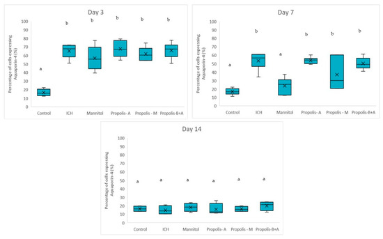 Percentage of cells expressing Aquaporin-4 on days 3, 7, and 14. Different letters indicate a statistically significant difference (p < 0.05). For example, groups labeled with ‘a’ and ‘b’ are significantly different from each other, while groups labeled with ‘ab’ and ‘b’ are not significantly different from each other.