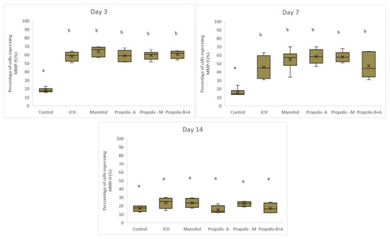 Figure 6 shows the percentage of cells expressing MMP-9. There was no significant difference between the treatment groups and the ICH group (p > 0.05). Conversely, there was a significant difference between the control group and all other groups (p < 0.05). A similar trend was observed on day 7. By day 14, there was no difference among all groups (p > 0.05). Moreover, Figure 7 shows the edema index. As expected, the control group had the lowest edema index on days 3, 7, and 14. On day 3, the edema indices in the mannitol, propolis-M, and propolis-B+A groups were significantly lower compared to the ICH group, with the lowest index recorded in the propolis-M group (p < 0.05). A similar trend was observed on day 7. By day 14, there was no difference among all groups (except for the control group).