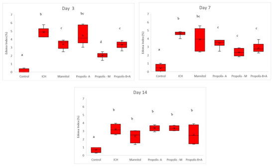 Edema index (%). Different letters indicate a statistically significant difference (p < 0.05). For example, groups labeled with ‘a’ and ‘b’ are significantly different from each other, while groups labeled with ‘ab’ and ‘b’ are not significantly different from each other.