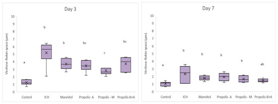 Virchow-Robin space (μm). Different letters indicate a statistically significant difference (p < 0.05). For example, groups labeled with ‘a’ and ‘b’ are significantly different from each other, while groups labeled with ‘ab’ and ‘b’ are not significantly different from each other.