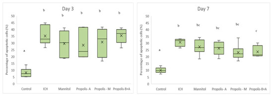 Figure 8 shows Virchow-Robin space (μm) measurements. On day 3, the control group had the smallest measurement, followed by the propolis-M group (p < 0.05). The ICH group appeared to have the largest Virchow-Robin space; however, this did not reach statistical significance when compared to the mannitol, propolis-A, and propolis-B+A groups. On day 7, the control group had the smallest space and was not significantly different compared to the propolis-B+A group (p > 0.05). All other groups had similar measurements (p > 0.05). Furthermore, Figure 9 shows the percentage of apoptotic cells measured using the TUNEL assay. The control group had the lowest number of apoptotic cells on days 3 and 7. On day 7, the propolis-B+A group had the lowest percentage of apoptotic cells among the treatment groups and was significantly different compared to the ICH group (p < 0.05). Table S1 presents all the means and standard deviations of the data.