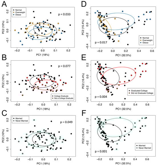 The beta diversity of the fecal microbiota samples was measured using the (A–C) Sorensen index and (D–F) Bray–Curtis index according to participants’ pre-pregnancy BMI category (A,D), education level (B,E), and marital status (C,F). The percent variation explained by each axis is in parenthesis, calculated from the PCoA eigen values. Ellipses are around the mean location of each maternal pre-pregnancy BMI category (A,D), education level status (B,E), and marital status (C,F). Each dot represents the composition of the gastrointestinal microbiota of one participant. Panel (A): PERMANOVA, p = 0.033; PERMDISP, p = 0.166. Panel (B): PERMANOVA, p = 0.077; PERMDISP, p = 0.889. Panel (C): PERMANOVA, p = 0.049; PERMDISP, p = 0.893. Panel (D): PERMANOVA, p = 0.017; PERMDISP, p = 0.015. Panel (E): PERMANOVA, p = 0.004; PERMDISP, p = 0.016. Panel (F): PERMANOVA, p = 0.001; PERMDISP, p = 0.015.