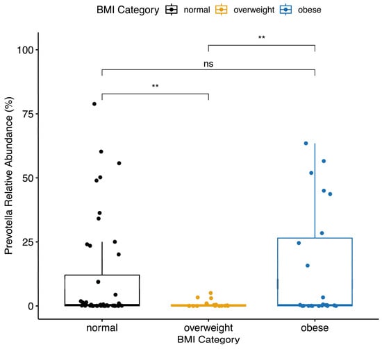 Women with a BMI category of overweight prior to becoming pregnant had significantly lower Prevotella relative abundance than women with normal weight or obesity prior to becoming pregnant. Boxplot center lines indicate median; boxes indicate interquartile ranges; and whiskers indicate 1.5× the interquartile ranges. ** = p < 0.01, ns = p > 0.05.