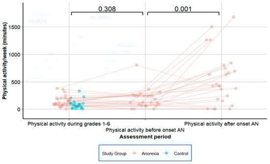 No significant change was reported between PA1-6 and PA-pre (p = 0.308), yet there was a more than threefold rise in PA from PA-pre to PA-post onset of AN (p = 0.001; Figure 2). Before AN onset, two out of 25 patients (8.0%) exercised for ≥6 h/week, and after AN onset this number increased to 17 of 25 patients (68.0%, p < 0.001). After AN onset, 20 of 25 patients (80%) reported the onset of new motivation for PA, and 19 (76%) reported in addition the new onset of high intensity in PA. There was no significant linear relationship between premorbid PA1-6 and its development before and after onset of AN (Table 3).