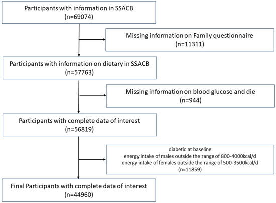 The Shanghai Suburban Adult Cohort and Biobank (SSACB) is an ongoing cohort study to assess the public health development of adult populations in Shanghai, China. At baseline, face-to-face interviews were conducted to collect data on demographics, diets, lifestyle, and general health conditions. Subsequent physical examinations were performed, and blood and urine samples were collected. Moreover, the cohort incorporated a health information system comprising electronic medical records, a chronic disease management system, a cancer registry, an infectious disease reporting system, and a death registration system to gather information on the incidence of T2D. All protocols and implementation methods can be found in our previous reports [27]. We set the cutoff date for follow-up as 1 March 2022. We excluded individuals with missing vital records and those who died during the study or who already had diabetes at baseline. Subsequently, a screening based on daily energy intake (male: 800–4200 kcal/d, female: 500–3500 kcal/d) was conducted, resulting in the final inclusion of 44,960 participants in the study (Figure 1).