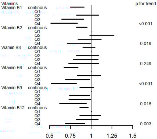 Figure 2 and Table S1 display the association between a single B vitamin intake and the risk of incident T2D by the logistic regression models. As continuous variables, dietary vitamin B1 (OR 0.82, 95%CI 0.74 to 0.91), vitamin B2 (OR 0.88, 95%CI 0.82 to 0.95), vitamin B6 (OR 0.75, 95%CI 0.67 to 0.84), and vitamin B12 (OR 0.91, 95%CI 0.86 to 0.96) were associated with a reduced risk of incident T2D. The highest intake of vitamin B1 (OR 0.65, 95%CI 0.51 to 0.83), vitamin B2 (OR 0.84, 95%CI 0.71 to 0.99), vitamin B6 (OR 0.65, 95%CI 0.52 to 0.82), vitamin B9 (OR 0.77, 95%CI 0.62 to 0.94), and vitamin B12 (OR 0.80, 95%CI 0.69 to 0.92) decreased the risk of diabetes compared to the lowest quantile (p for trend <0.05). Table S2 presents the logistic model results without adjusting baseline glycated hemoglobin; the associations between incident T2D and vitamin B1, B6, B9, and B12 remained statistically significant (p-value < 0.05).