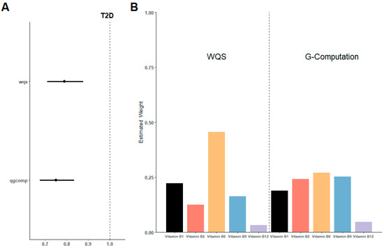 Estimated risk and weighted values of B vitamins for T2D by WQS and QGcomp models. (A) Associations of B vitamins with T2D risk. (B) Weighted values of B vitamins for T2D. Models were adjusted for sex, age, HbA1C (%), education, smoking status, drinking alcohol status, physical activity, body mass index, energy intake, and family history of diabetes.
