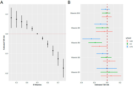 Weighted quantile sum regression (WQS) was applied to explore the overall effects of B vitamins on T2D and the weight estimate of each B vitamin. R package (“gWQS”) calculated the WQS index comprising weighted sums of individual relevant B vitamin intake, representing the mixed intake levels of B vitamins, and the components of concern were identified by weights. The final result could be interpreted as the concurrent impact on T2D of a one-quantile increase of mixed B vitamins.