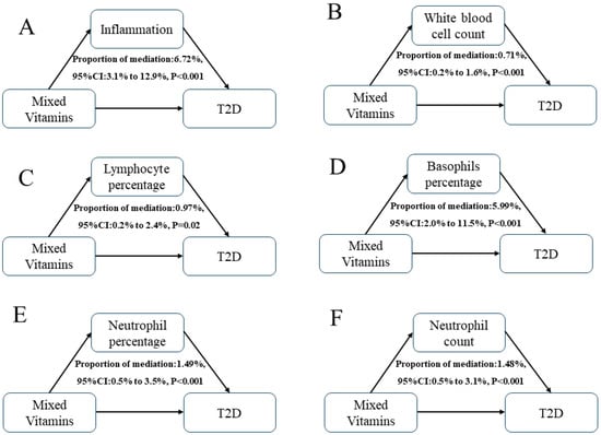 Mediation analyses were performed to assess the potential effect of inflammation on the relationship between mixed B vitamins and T2D (Table 3 and Figure 5). Blood white blood cell count (B), lymphocyte percentage (C), basophils percentage (D), neutrophil percentage (E), and neutrophil count (F) showed a sign mediating role in the associations between mixed B vitamins and T2D risk, with mediation proportions of 0.71%, 0.97%, 5.99%, 1.49%, and 1.48%, respectively. Moreover, a combined mediating model (A) using the joint level of five biomarkers as the mediator exhibited the highest mediation proportion of 6.72% (95%CI 3.1% to 12.9%).