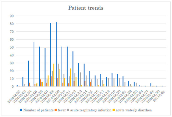 The changes in the number of patients treated are shown in Figure 1. In addition, during Phase 3, there was an overlap between infectious disease outbreaks and meal arrangements in the shelters. Within the shelters, gastrointestinal symptoms were prevalent (see Figure 2), and according to the TMAT-aggregated Jspeed (Japanese minimum data set), the most common diseases throughout the period were gastrointestinal infections and food poisoning (Jspeed No. 18), accounting for 19% of cases. A high number of people had diarrhea, which worsened the state of malnutrition and the need to adapt to the diet.