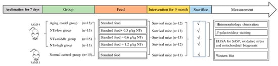 The SPF SAMP8 and SAMR1 mice (3-month-old males) were procured from the Department of Experimental Animal Science at Peking University and were subsequently housed individually in barrier-grade animal rooms with a 12 h alternating light cycle. The temperature was 24 ± 2 °C, and relative humidity was 50–60%. The mice were allowed to feed and drink freely. After 1 week of feeding for adaptation, all SAMP8 mice were grouped as follows: aging model (Aging), NTs-low (NTs-L), NTs-middle (NTs-M), and NTs-high (NTs-H) groups of 15 mice. Meanwhile, SAMR1 mice were set as the normal control group (Normal, n = 15). The Aging and Normal groups were provided with standard food (American Institute of Nutrition Rodent Diets-93M), while varying doses of exogenous NTs were incorporated into the standard food for the three NT-intervention groups. Detailed information regarding the groups, diet, and number of animals can be found in Figure 1. After a 9-month intervention, some of the dorsal skin tissue underwent partial pathological testing and others was subsequently collected and stored at −80 °C until Western blot analysis was conducted.