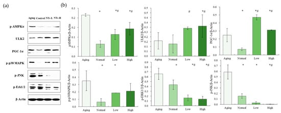 The Aging group exhibited a higher expression of pAMPK, which was subsequently upregulated following intervention with NTs (p < 0.05). While there was an increasing trend in ULK2 expression among the intervention groups, no significant differences in ULK2 expression were observed between the Aging group and the Normal group (p > 0.05). However, following intervention with a high dose, ULK2 expression significantly increased (p < 0.05).
