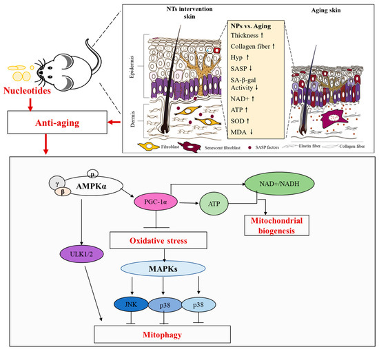 The skin, serving as the body’s primary defense against external elements, plays a crucial role in protecting the body from infections and injuries, as well as maintaining overall homeostasis. Skin aging, a common manifestation of the aging process, involves the gradual deterioration of its normal structure and repair mechanisms. Addressing the issue of skin aging is increasingly imperative. Multiple pieces of evidence indicate the potential anti-aging effects of exogenous nucleotides (NTs) through their ability to inhibit oxidative stress and inflammation. This study aims to investigate whether exogenous NTs can slow down skin aging and elucidate the underlying mechanisms. To achieve this objective, senescence-accelerated mouse prone-8 (SAMP8) mice were utilized and randomly allocated into Aging, NTs-low, NTs-middle, and NTs-high groups, while senescence-accelerated mouse resistant 1 (SAMR1) mice were employed as the control group. After 9 months of NT intervention, dorsal skin samples were collected to analyze the pathology and assess the presence and expression of substances related to the aging process. The findings indicated that a high-dose NT treatment led to a significant increase in the thickness of the epithelium and dermal layers, as well as Hyp content (p < 0.05). Additionally, it was observed that low-dose NT intervention resulted in improved aging, as evidenced by a significant decrease in p16 expression (p < 0.05). Importantly, the administration of high doses of NTs could improve, in some ways, mitochondrial function, which is known to reduce oxidative stress and promote ATP and NAD+ production significantly. These observed effects may be linked to NT-induced autophagy, as evidenced by the decreased expression of p62 and increased expression of LC3BI/II in the intervention groups. Furthermore, NTs were found to upregulate pAMPK and PGC-1α expression while inhibiting the phosphorylation of p38MAPK, JNK, and ERK, suggesting that autophagy may be regulated through the AMPK and MAPK pathways. Therefore, the potential induction of autophagy by NTs may offer benefits in addressing skin aging through the activation of the AMPK pathway and the inhibition of the MAPK pathway.