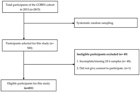 Furthermore, since the study population is finite and small (2815), we used the modified version of the Cochran formula in the next step to derive the required sample []. The required sample size for this study was 338 based on the modified formula. However, in order to account for the higher likelihood of a non-response, urine sample wastages, and under-representation of demographic subgroups, we conveniently oversampled the population until a maximum cap of 500 was reached. A total of 49 samples were excluded from further analysis as they were ineligible because of missing 24 h samples (48) and non-consent (1), resulting in a sample size of 451 (Figure 1).