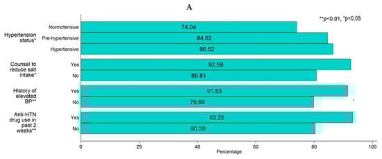 A high proportion of participants (83%) were aware that high salt intake causes health problems. The participants’ hypertension status (p < 0.05), counselling by a health professional to reduce dietary salt (p < 0.05), antihypertensive drug use in the past 2 weeks (p < 0.01), and history of elevated BP (p < 0.01) were associated with salt-related knowledge. More than half (55%) and nearly one-fifth (19%) of the participants self-perceived consuming normal and extremely high/high salt, respectively. Self-perceived salt consumption was associated with sex (p < 0.01), hypertension status (p < 0.05), counselling by a health professional to reduce dietary salt (p < 0.001), antihypertensive drug use in the past 2 weeks (p < 0.001), history of elevated BP (p < 0.001), and history of diabetes (p < 0.05). Similarly, most (87%) of the participants felt it was very important/somewhat important to reduce salt in their food, which was associated with counselling by a health professional to reduce dietary salt (p < 0.05), a history of elevated BP (p < 0.05), and antihypertensive drug use in the past 2 weeks (p < 0.01) (Table 2, Figure 2).