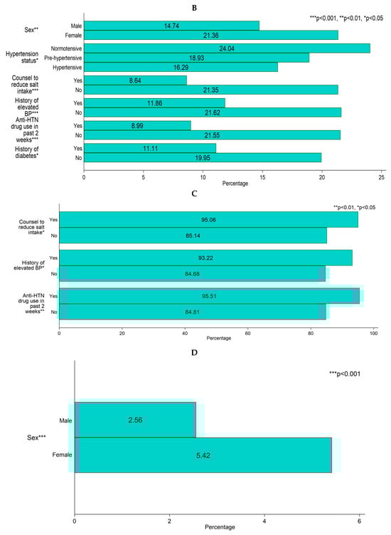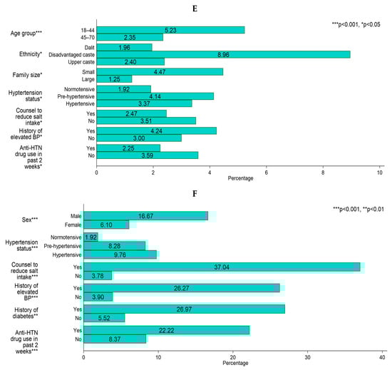 Percentage of participants with salt-related KAB in relation to socio-demographic characteristics: (A) salt-related knowledge—yes; (B) salt-related attitudes: self-perceived salt intake—consuming extremely high/high salt; (C) salt-related attitudes: the importance of lowering salt intake; (D) salt-related behaviours—add extra salt; (E) salt-related behaviours—processed food consumption; and (F) salt-related behaviours—take actions to control salt intake.