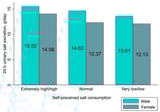 The present study determined that 81% of participants regarded their salt intake as normal (55%) or very low/low (26%). However, analysis of the 24 h urinary assessments revealed that almost all participants (98%) exceeded the recommended daily salt intake of <5 g. This disparity between self-perceived and actual salt consumption suggests a lack of awareness among participants regarding their salt intake. Similar findings were reported in previous studies [,,,,], indicating a tendency for individuals to underestimate their salt consumption, which can result in dietary misconceptions [] and lead to fewer people adopting salt reduction measures. Indeed, there was a positive correlation between self-perceived salt consumption and 24 h salt excretion, behaviours of adding extra salt, and processed food consumption in the regression analyses. On the other hand, those with a self-perception of lower salt consumption were significantly more likely to take actions to control salt intake. These results suggest that participants’ self-perception of salt intake may influence both their actual salt consumption and their readiness to adopt salt reduction measures. Therefore, targeted interventions are necessary to increase awareness among high-risk groups and promote a reduction in salt intake when individuals perceive that they consume an excessive quantity.