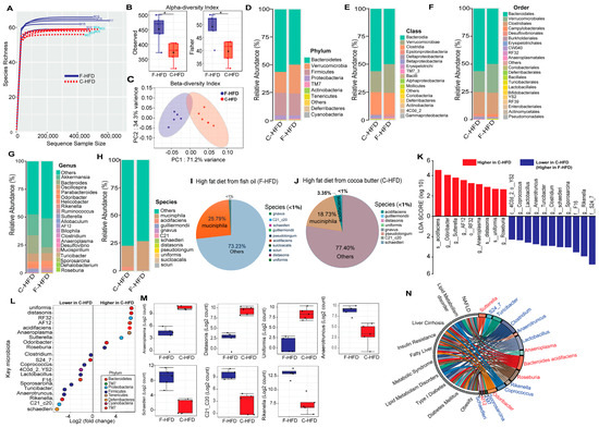 Microbial diversity analysis reveals altered gut microbiota in C-HFD compared with F-HFD-fed mice. (A) Influence of 16S rRNA gene sequencing depth on rarefaction analysis was assessed. Rarefaction curves of different samples are shown, with at least 600,000 V3/V4 16S rRNA sequences per sample. Rarefaction curve was created by randomly re-sampling the pool of N samples several times and then plotting the average number of species found in each sample. Typically, it initially grows rapidly as the most common species are found and then slightly flattens out as the rarest species remain to be sampled. Rarefaction curves of different samples collected from C-HFD and F-HFD fed mice are shown (B) Alpha diversity across samples from C-HFD and F-HFD fed mice is compared and the differences in alpha diversity metrics of microbial diversity and richness in the gut microbiota of mice fed on two different diets are shown as box plots including the observed number of OTUs and Fisher. Significances marked with an asterisk (*) for p ≤ 0.05 refer to the comparisons between C-HFD and F-HFD dietary groups. (C) Principal component analysis (PCA) of unweighted UniFrac distances calculated by using 16S rRNA microbiome data set shows that C-HFD data (n = 5, red color) are clustered separately from F-HFD data (n = 5, blue color), p value < 0.05. PC1 and PC2 represent the top two principal coordinates that captured most of the variance, with the fraction of variance captured by that coordinate shown as a percentage. Relative abundance of microbial communities associated with C-HFD and F-HFD feeding in mice. (D) Phylum (E) Class (F) Order (G) Genus and (H) Species level composition of the identified bacterial communities regarding each dietary group. (I,J) Pie charts of gut microbial species composition in mice fed with C-HFD and F-HFD (n = 5 mice per group). (K) Differentially abundant bacteria between C-HFD and F-HFD mice groups are depicted. Linear discriminant analysis (LDA) effect size (LEfSe) comparison of the differentially higher and lower abundance microbial taxa in C-HFD group vs. F-HFD group are shown; 5 mice each group. Log-level changes in LDA score are displayed on the y-axis. Top microbiota of significance by response with an LDA score of >2 as determined using LEfSe. Red bars: taxa found in greater relative abundance in C-HFD and blue bars: taxa found in lower relative abundance in F-HFD (L) Dot plot showing the differentially abundant operational taxonomic units (OTUs) where OTUs are grouped by genera along the y-axis and colored as per identified phyla. The x-axis indicates the log2 fold-change in key microbiota (OTUs) in C-HFD-fed mice compared with F-HFD fed mice as the baseline. (M) Box plots showing the significant difference concerning fold differential abundance of taxa identified in the gut microbiomes of C-HFD and F-HFD fed mice. (N) Predicted interactions between the identified biomarker gut microbiota and the associated metabolic disorders.