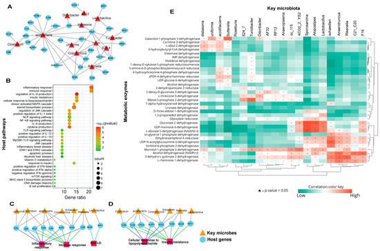 Functional enrichment analysis of the host genes associated with key microbes expressed differentially between C-HFD and F-HFD fed mice. (A) Predicted interactions showing associations between the host genes and the differentially expressed biomarker gut microbiota. (B) Host pathways enriched for the host genes associated with key gut microbes composition. The size of the dots represents the significance of enrichment for each pathway, and color of the dots denotes the number of host genes in which this pathway is significantly associated with microbiome composition. (C,D) Networks showing specific gut microbes associated with particular host genes enriched for disease-specific host pathways. Triangular nodes represent the gut microbes, circular nodes represent the host genes, and rectangular nodes represent the pathways. Edge colors represent the host gene-pathway associations. (E) Association between microbial genera and metabolic enzymes and metabolites. Correlation between the differentially expressed microbial taxa in C-HFD mice, compared with F-HFD mice, was assessed using linear regression analysis. A heat map of Pearson’s correlations between the differentially expressed gut microbiota and metabolic enzymes or metabolites is shown. Microbial genera are displayed on the x-axis whereas metabolic enzymes and metabolites are shown on the y-axis. Cyan color represents the inverse associations and red color denotes the positive associations. Symbols on the plot represent the significance level with an asterisk (*), denoting the Bonferroni significant associations at p < 0.05.