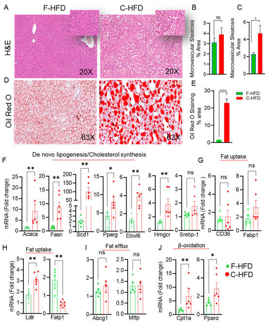 We speculated that the pathological shift in gut microbiota observed in mice fed with C-HFD could lead to induce hepatic steatosis and liver inflammation in these mice. We next investigated the liver tissue phenotypes of mice fed these diets. As expected, the livers from C-HFD fed mice showed increased fat accumulation. No fat accumulation was observed in the livers of F-HFD fed mice (Figure 3A). Hepatic steatosis (microvesicular and macrovesicular) of mixed type was most obvious (Figure 3B,C). Hepatic lipid accumulation was confirmed by oil red O-staining of the liver sections, which revealed numerous lipid droplets that were not observed in the livers of mice fed with F-HFD (Figure 3D,E). Consistent with the development of hepatic steatosis, RT-qPCR analyses of the liver specimens from C-HFD mice indicated significantly upregulated expression of the genes involved in de novo lipogenesis (Acaca: acetyl CoA carboxylase; Fasn: fatty acid synthetase, Scd1: stearoyl Coa desaturase 1; Ppar-γ: Peroxisome proliferator-activated receptor gamma) and TG synthesis (Elovl6: Fatty Acyl-CoA Elongase), compared with F-HFD mice (Figure 3F). The expression of cholesterol synthesis associated genes (Hmgcr: 3-Hydroxy-3-Methylglutaryl-CoA Reductase, Srebp1: sterol regulatory element-binding protein 1) was also found to be increased in C-HFD mice (Figure 3F). However, no difference was observed in the mRNA expression of fat uptake genes CD36 and Fabp1 between the two groups of mice (Figure 3G). The low-density lipoprotein receptor (Ldlr) which plays a role in uptake of cholesterol was upregulated in the livers of C-HFD fed mice (Figure 3H). Fatty acid transport protein 1 (Fatp1) gene expression was downregulated in livers of mice fed with C-HFD (Figure 3H). No significant changes were observed in the expression of genes associated with fat efflux (Abcg1: ATP binding cassette G1, Mttp: microsomal triglyceride transfer protein) between two dietary groups (Figure 3I). Interestingly, mRNA expression of β-Oxidation genes carnitine palmitoyltransferase 1a (Cpt1a) and peroxisome proliferator activated receptor alpha (Pparα) were significantly elevated in C-HFD mice (Figure 3J).