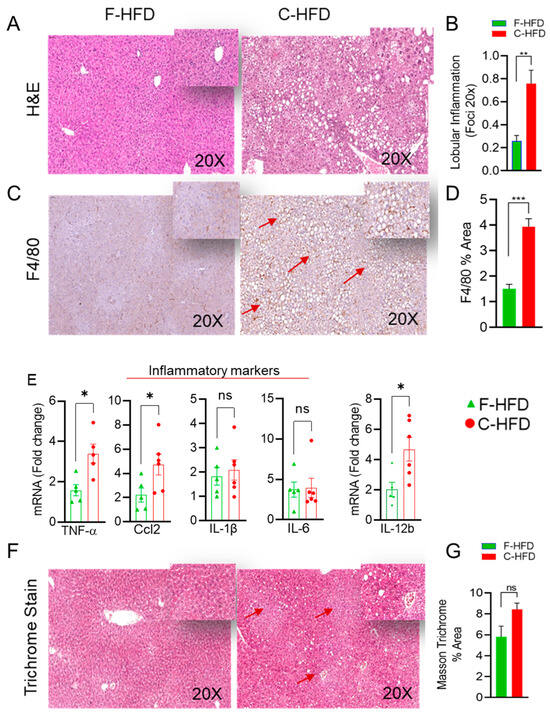Since the gut microbiome analyses suggested that microbial dysbiosis associated with inflammatory pathways, we assessed inflammation in the livers of the mice fed either with C-HFD or F-HFD. As expected, H&E staining of the liver specimens of C-HFD mice revealed presence of the lobular inflammation. However, no inflammation was seen in the livers of the mice fed with F-HFD (Figure 4A,B). Furthermore, C-HFD feeding resulted in the accumulation of F4/80-positive macrophages (Figure 4C,D), indicating active liver inflammation. Consistent with the infiltration of macrophages and lobular inflammation, genes related to liver inflammation (Tnf-α, Ccl2 and Il12b) were significantly upregulated in C-HFD mice compared with F-HFD mice (Figure 4E). However, no significant difference was observed in the expression of Il-1β and Il6 between the two dietary groups (Figure 4E). Trichrome blue-green staining of collagen fibers was performed to determine the relative extent of fibrosis in the C-HFD mice livers compared with F-HFD mice livers which indicated a trend in fibrosis in the livers of C-HFD mice, but it was not statistically significant (Figure 4F,G).