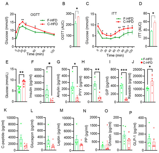 C-HFD feeding impairs glucose and insulin tolerance as well as C-HFD ameliorates glucose tolerance and insulin resistance in mice. (A,B) Oral glucose tolerance test (OGTT) at 21 weeks of C-HFD and F-HFD feeding and the area under curve (AUC) are compared for C-HFD and F-HFD mice. (C,D) Insulin tolerance test (ITT, i.p.) at 22 weeks of C-HFD and F-HFD feeding and the area under curve (AUC) are compared for C-HFD and F-HFD mice. (E,F) Fasting plasma glucose and insulin levels in mice at 24 weeks of C-HFD and F-HFD feeding. (G–P) Fasting blood metabolic markers profiles were determined using Milliplex assay kits and levels of c-peptide, glucagon, amylin, leptin, PYY, PP, ghrelin, GLP-1, GIP, and resistin are compared between C-HFD and F-HFD mice. Data are presented as mean ± SEM values. * p < 0.05 was considered significant; ** p < 0.01 was considered highly significant, *** p < 0.001 was considered extremely significant.
