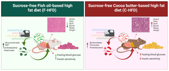 The human microbiome is comprised of two major phyla, including Bacteroidetes, and Firmicutes. The Bacteroidetes phylum includes four major classes, namely Bacteroidia, Flavobacteria, Sphingobacteria, and Cytophagia, all of which ferment indigestible carbohydrates [9]. The Firmicutes are classified into three major classes including Clostridium, Negativicute, and Bacillus, which generate short-chain fatty acids [10]. Several studies have shown that the altered Firmicutes/Bacteroidetes (F/B) ratio is a biomarker for dysbiosis and suggested that a higher F/B ratio might relate to obesity in animals and humans [11,12]. However, others reported that the F/B ratio had no association with gut microbial alteration patterns and with microbiome functional shift [13]. As a result, interest has increased in understanding the effects of dietary fats on gut microbiome. Dietary fat provides energy, and there are many major food sources of dietary fats. Lard and palm oil are high in saturated fatty acids which are considered bad for health [14]. Fish oil and olive oil are high in unsaturated fatty acids which are considered good for health. Excessive consumption of saturated fats substantially impacts the intestinal microbiota and body weight. Conversely, a higher consumption of unsaturated fatty acids is regarded as beneficial for health [15]. Cocoa butter is widely in the form of chocolate and the metabolic and physiological effects of this fat remain unclear. Cocoa butter and fish oil are the dietary fats that most likely have different health effects. Cocoa butter is extracted from the cocoa bean and it mainly contains saturated fat (24–30% palmitic acid and 24–37% stearic acid), 30–38% monounsaturated fat (oleic acid), and 1% polyunsaturated fat (linoleic acid), in addition to low levels of lauric acid and myristic acid [16]. Whereas, fish oil is rich in omega-3 fatty acids which are known to have health benefits owing to their anti-inflammatory and anti-cancer effects [17]. It was shown that cocoa butter-based high-fat feeding in rats for three days did not affect plasma total triglyceride (TG) levels or TG-rich very low-density lipoprotein (VLDL) particles or hepatic insulin sensitivity, but the changes in hepatic gene expression led to increased lipid synthesis, lipotoxicity, inflammation, and insulin resistance [18].