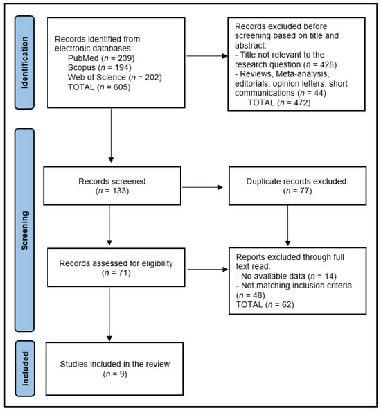 Data was processed using Microsoft Excel version 2023 (Microsoft Corporation, Redmond, WA, USA) and graphics were created using Python version 3.9 (Wilmington, DE, USA). The data collection process for this systematic review commenced with the removal of 77 duplicate entries, followed by a rigorous screening of 133 abstracts by two independent reviewers to assess each study’s relevance based on predefined inclusion and exclusion criteria. Of the 71 records assessed for eligibility, 14 were excluded by having no available data or by not matching the inclusion criteria (n = 48). Discrepancies between reviewers were resolved through discussion or, if necessary, consultation with a third reviewer to achieve consensus. The initial database search yielded a number of 605 articles, from which 9 relevant studies were identified for inclusion in the final study, as presented in Figure 1.