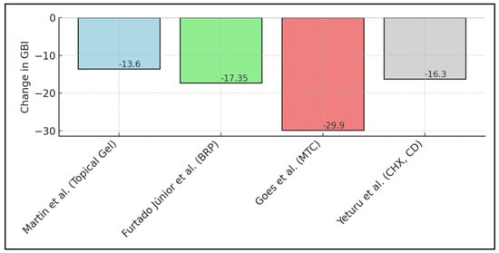 Gingival bleeding index changes (before and after intervention) across different natural compounds: BRP—Brazilian red propolis; MTC—Matricaria chamomile; CHX—chlorhexidine; CD—chlorine dioxide. Data is from [,,,].