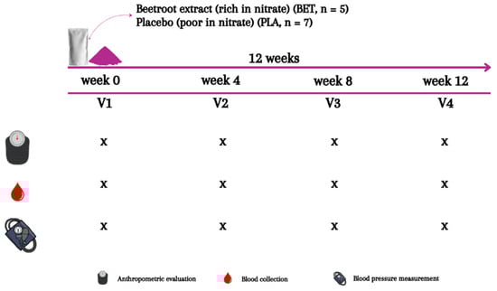 This was a randomized, double-blind, placebo-controlled, and parallel study with a total duration of 12 weeks. During the study period, the participants reported to the laboratory at Federal University of Rio de Janeiro (Multidisciplinary Center UFRJ-Macaé) on four occasions. Upon the first visit (week 0), anthropometric evaluation was conducted and blood samples and hemodynamic measurements were taken for baseline measurements before supplementation. Afterwards, participants were randomized to treatment (i.e., beetroot extract supplement (BET)) or control (i.e., placebo (PLA)) groups using a free web-based randomization tool (www.randomization.com). Groups A and B were labeled as beetroot extract or placebo by tossing a coin. Beetroot extract supplement and placebo were portioned in pre-packed sachets (equal in weight and similar in appearance) and consecutively numbered for each participant according to the randomization schedule. Each participant was assigned an order number and received the intervention in the corresponding pre-packed sachets. Both the participants and the investigators were blinded to the group allocation. A staff laboratory member who was not involved in the study was responsible for the blinding, group assignment, and allocation concealment. Participants from both BET and PLA groups received the supplements during their first visit, took them home, and were instructed to ingest 10 g of the BET or PLA supplement diluted in 250 mL of water, respectively, twice a day for twelve weeks. Participants received supplements every week and were asked about their adherence to the intervention and possible complications. Anthropometric evaluation was conducted, and blood samples and hemodynamic measurements were taken again in the middle (week 4 and week 8) and at the end of the study period (week 12) (Figure 2). These assessments were carried out at least 12 h after they ingested the second supplement package from the previous day, to avoid acute effects of the supplements. Participants were instructed to maintain their daily routine throughout the study period. Furthermore, participants were asked to fast for at least 12 h (overnight fasting) and refrain from physical exercise for 24 h before each test visit. All visits to the laboratory were held between 08:00 a.m. and 09:00 a.m. At the end of each visit, the participants received a snack consisting of bread and cheese with coffee.