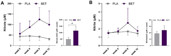 Changes in plasma NO metabolites between beetroot extract (BET) and placebo (PLA) groups over the 12-week supplementation period. (A) Nitrate (B) Nitrite. * Indicates difference (p < 0.05) between groups.