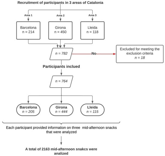 A sample of 764 participants from Barcelona, Girona, and Lleida allowed 2163 mid-afternoon snacks to be analyzed as described in Figure 1.