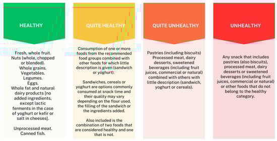 In order to study the nutritional characteristics of mid-afternoon snacks, a review of the existing scientific evidence and official public health nutrition recommendations on mid-afternoon snacks was initially carried out. In addition, an electronic search using four major health sciences academic databases (Google Academic [Google LLC, Mountain View, California, United States], PubMed® [National Center for Biotechnology Information at the U.S. National Library of Medicine, Bethesda, Maryland, United States], Scopus [Elsevier, Amsterdam, Netherlands], Cochrane [Cochrane Collaboration, London, United Kingdom], and Web of Science [Clarivate Analytics, London, United Kingdom]) was conducted by combining different keywords (mid-afternoon snack, dietary patterns, children, childhood, toddlers). The search included literature published from 2005 to 2021, and only articles in English and Spanish were selected. Specifically, the criteria for assessing the quality of snacks were drawn from reference documents such as ASPCAT’s guidelines for healthy breakfasts and mid-afternoon snacks [20], the healthy eating guide for families of schooled children [29], and various international guides published by official organizations [21,22,23,24]. These sources provide recommendations on the composition of a healthy snack. We defined four categories (healthy, quite healthy, quite unhealthy, and unhealthy) based on the review of the existing scientific evidence on mid-afternoon snacks. This four-category classification (Figure 2) was used to analyze the nutritional quality of each mid-afternoon snack.