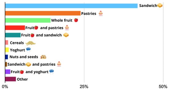 A total of 2163 mid-afternoon snacks consumed by the 721 participants over three school days were analyzed, and it was found that sandwiches were the most consumed option (41.89%), followed by pastries (23.86%), whole fruit (14.38%), and a combination of fruit and pastries (6.29%). Figure 3 shows the 11 most frequent food products or combinations of them. The analysis of the composition of the sandwiches showed that more than half (57.74%) were made with bread and processed meat, 23.53% with chocolate (solid or spreadable), and the rest with cheese (15.79%), tuna (2.17%), omelet (0.46%), or vegetable pâté (0.31%).