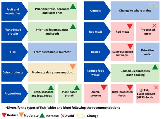 In the Spanish context, the Mediterranean diet facilitates ensuring the adequate intake of nutrients and preventing non-communicable chronic diseases and also exhibits a low environmental footprint [30]. In addition, in terms of the foods that should be prioritized, Figure 5 was conceived to summarize the recommendations for healthy and sustainable foods [50,64]. Because, although healthy eating was the main focus in the school stage until a few years ago, it is now necessary to add sustainability criteria and align with the recent Food Based Dietary Guidelines in Spain that incorporate the food sustainability dimension [65]. This implies that, instead of solely focusing on what we eat, attention is also paid to how we eat.
