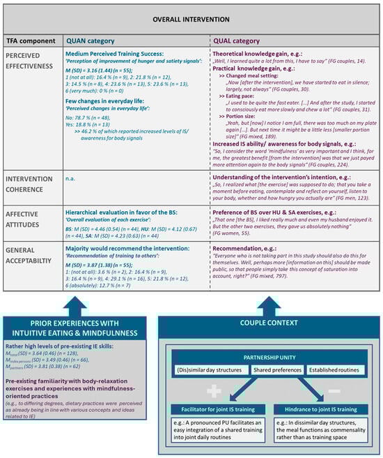 Overview of selected results regarding the overall intervention acceptance and main context factors. Note. QUAN = quantitative, QUAL = qualitative, FG = focus group, M = mean, SD = standard deviation, IE = Intuitive Eating, IS = Interoceptive Sensitivity, BS = Body Scan, HU = hunger exercise, SA = satiety exercise, and PU = Partnership Unity. This figure contains selected results on the overall intervention acceptance. For more detailed information on the acceptance of the respective exercises and respective TFA components, as well as further primary data (QUAN/QUAL), please see Multimedia Supplementary S1 (PIP).