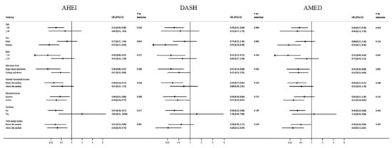 Stratified analyses of associations between three dietary scores and risk of metabolic dysfunction-associated steatotic liver disease (comparing the highest tertile of the dietary score with the lowest tertile). Odds ratios were adjusted for age (continuous), sex (male or female), education level (high school and below or college and above), monthly household income (<7000, ≥7000 yuan/capita), marriage (single/divorced/widowed or married/living together), physical activity (<21, ≥21 metabolic equivalents of task-hours/week), smoking (yes or no), and total energy intake (continuous). OR = odds ratio; CI = confidence interval.