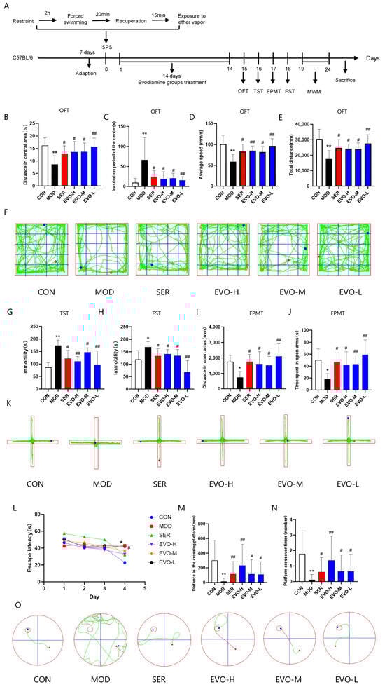 2.1. Effects of EVO on Behavioral Deficits in SPS-Induced PTSD Mice