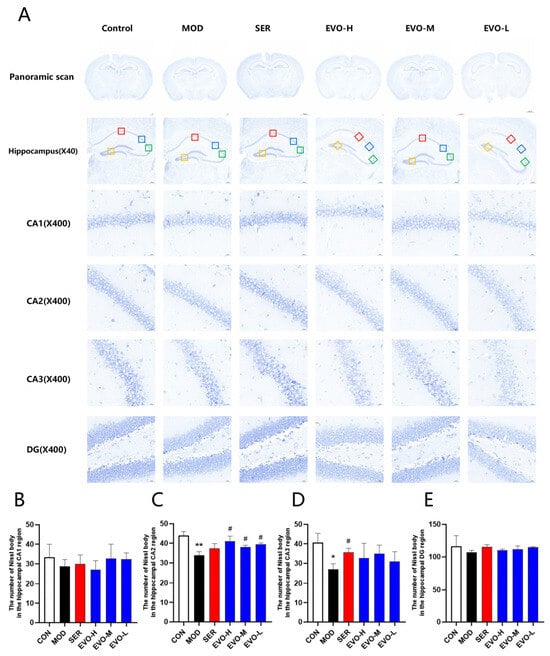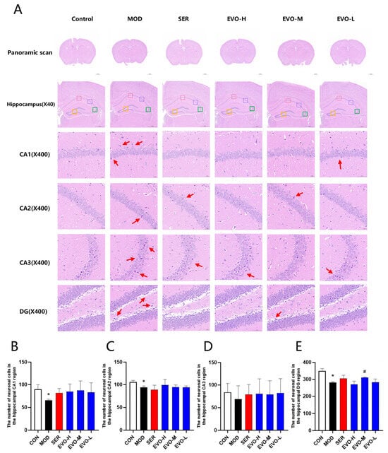 2.2. Effects of EVO on Hippocampal Morphology in SPS-Induced PTSD Mice