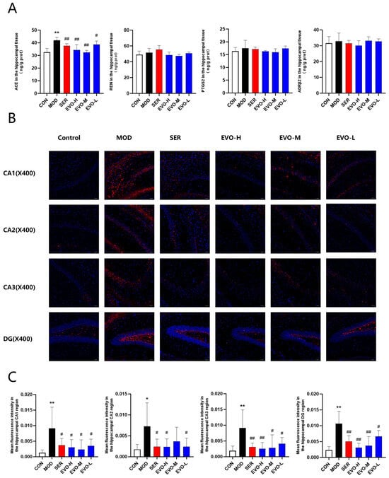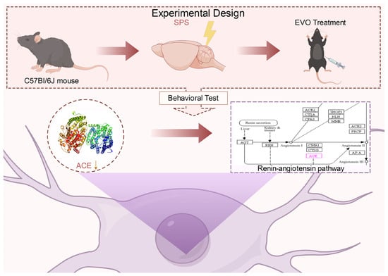 2.8. Effects of EVO on Core Target Levels and the Renin–Angiotensin Pathway in the Hippocampus of SPS-Induced PTSD Mice