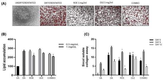 Total soluble collagen was quantified in 3T3-L1 cell supernatants using the Sircol collagen assay. Supernatants from the cell cultures were collected at various time points: 6, 9, and 13 days of adipocyte differentiation (Figure 2C). The DAs showed a higher accumulation of collagen at 9 days of differentiation, compared to 6 days, followed by a significant reduction at 13 days. ROE and COMBO showed a reduction of collagen during each time point compared to OLE treatment.
