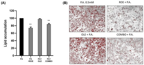 (A) The effects of the ROE and OLE, alone and in combination, on lipid droplet accumulation following exposure to PA 0.5 mM (** p < 0.005 vs. PA). (B) Representative images of Oil Red O’ staining on 3T3 cells co-treated for 48 h with PA 0.5 mM and ROE and OLE, alone and in combination. The data are indicated as means ± SEMs. (B) Scale bar 400 μm is reported in each panel. All images are original and unedited.